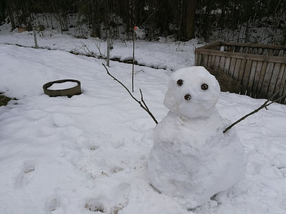 木の枝の手に松ぼっくりの目と鼻。森の雪だるま完成~♪